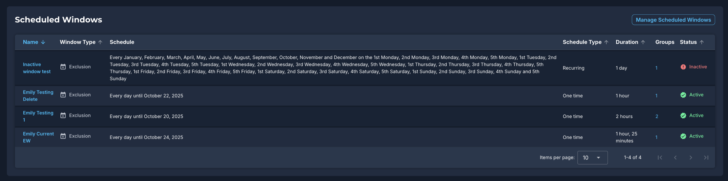 The Scheduled Windows section shows whether the device is in a group that has a scheduled exclusion window, where policies will be prevented from executing during that time frame. See Scheduled Windows and Scheduled Windows FAQ for more information. You can also find information about managing scheduled exclusion windows in Managing Exclusion Windows.