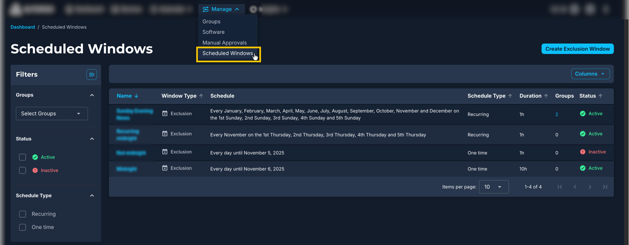 Use Scheduled Windows to control when Automox performs or pauses tasks on devices. This page lists all scheduled windows in your organization. You can currently schedule exclusion windows, which allow you to pause tasks such as patching, policy execution, or worklets.